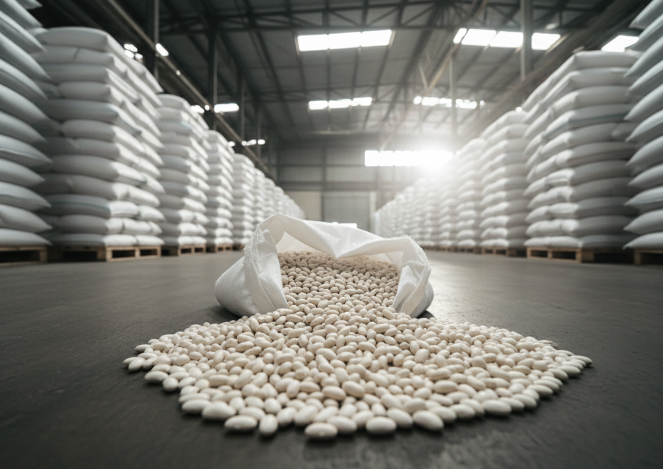 أكياس 25 كجم من البولي بروبلين الأبيض، متينة ونظيفة. سهلة الحمل والتخزين. إمكانية توفير أكياس 50 كجم عند الطلب.