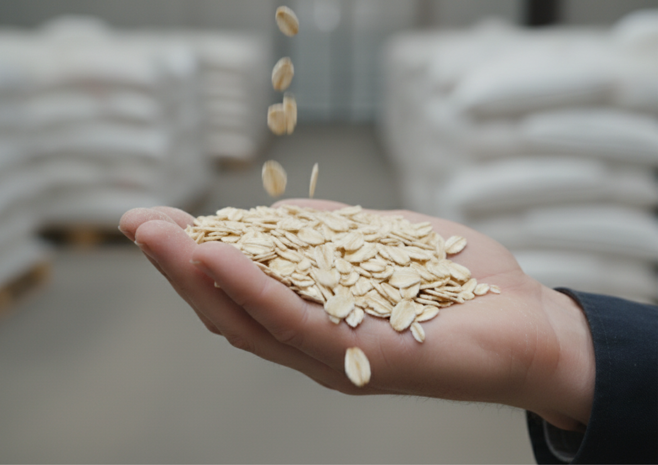 Type : Flocons laminés (Rolled Oats). Couleur : Blanc Crème. Cuisson : Rapide (3-5 min). Conditionnement : Sacs Kraft 25kg.