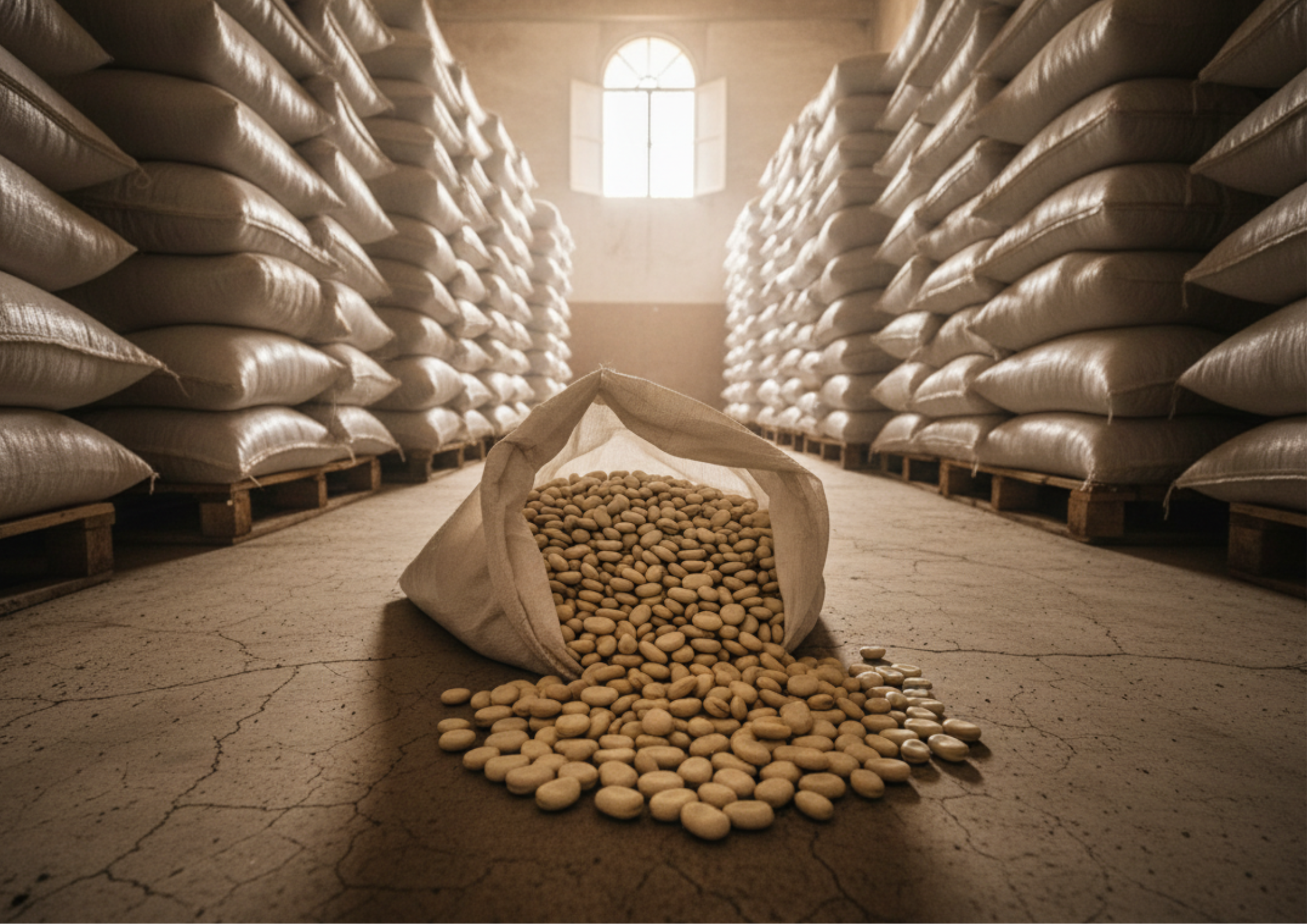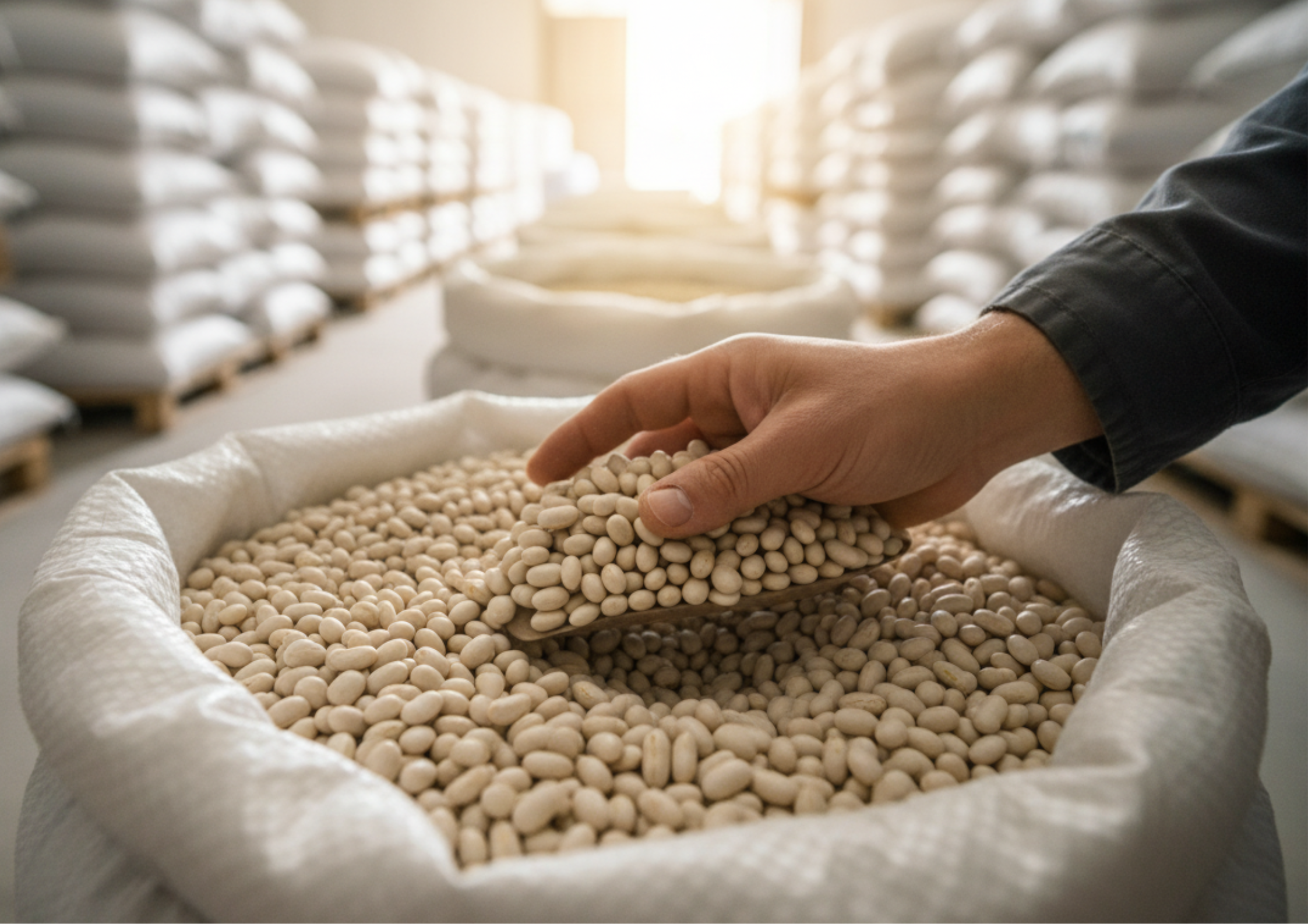 Variété : Cannellini local. Calibre : Moyen à Petit. Cuisson : Très rapide (Fondante). Conditionnement : Sacs 50kg ou 100kg.