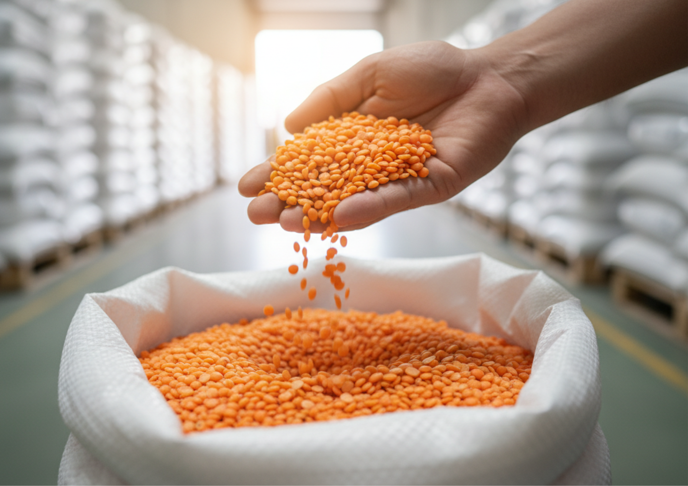 Variété : Crimson ou Football (Entière/Cassée). Couleur : Orange vif. Cuisson : Instantanée (Fondante). Conditionnement : Sacs 25kg.