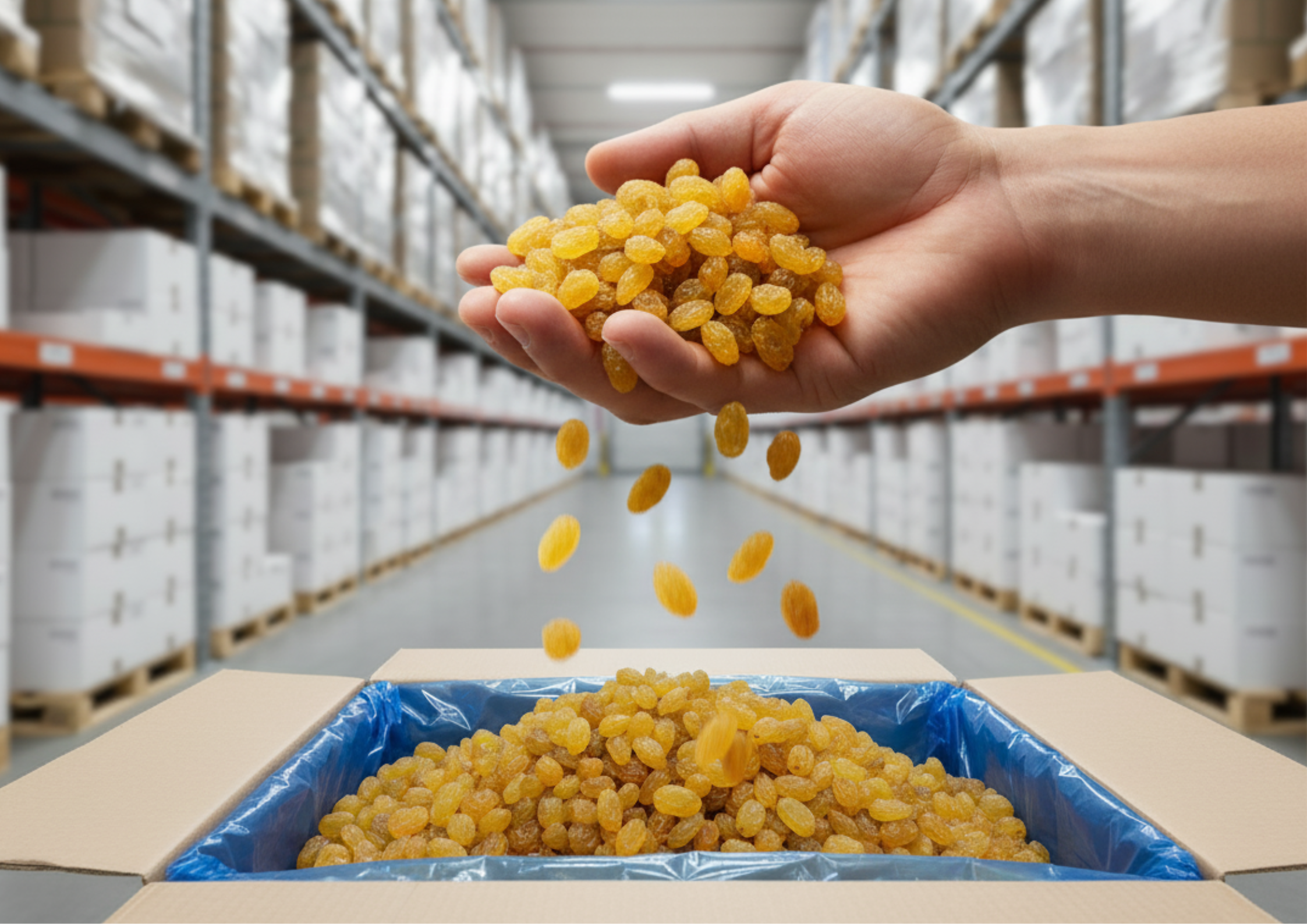 Golden Anguri / Sultanine. Couleur : Jaune Or / Ambré. Calibre : Standard. Conditionnement : Carton 10kg ou 12.5kg.